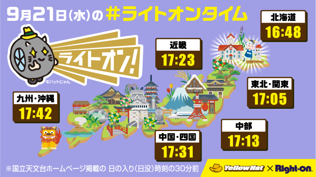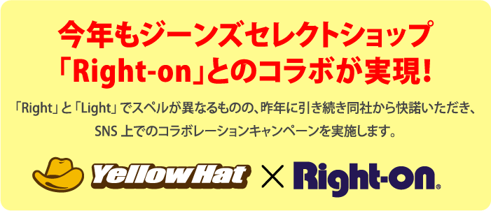 ・本キャンペーンに参加する際は必ず、イエローハット公式Twitterアカウント「@yellowhat_ltd」とRight-on公式Twitterアカウント「@righton_pr」の2つのアカウントを両方フォローしてください。
