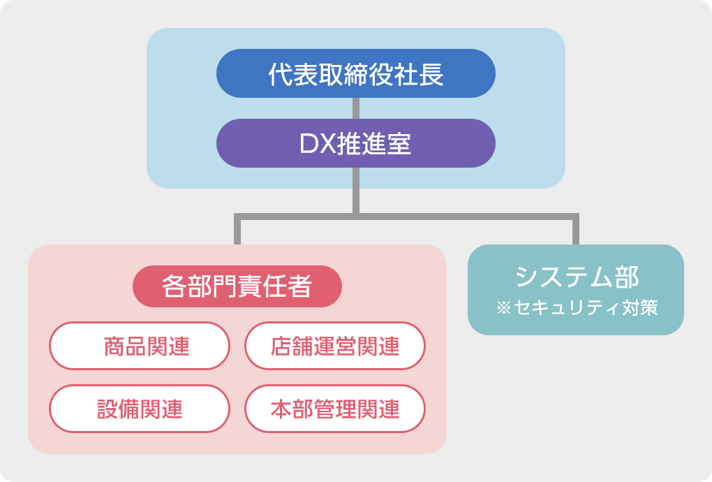 「DX推進室」を代表取締役社長管下に新設し、DX推進担当取締役を実務責任者とします。DX推進室では、組織全体からDXに関連するアイデアを集め、DXの推進に適した人材を確保し一貫性と柔軟性を備えたシステムを構築することで、既存サービス、ビジネスモデルの変革を進めてまいります。